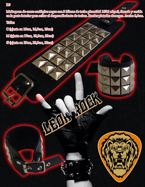 Muñequera de cuero ecológico negro con 3 hileras de tacha piramidal 15/15 níquel.